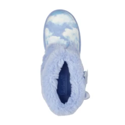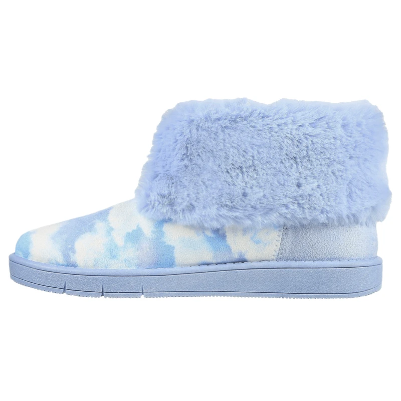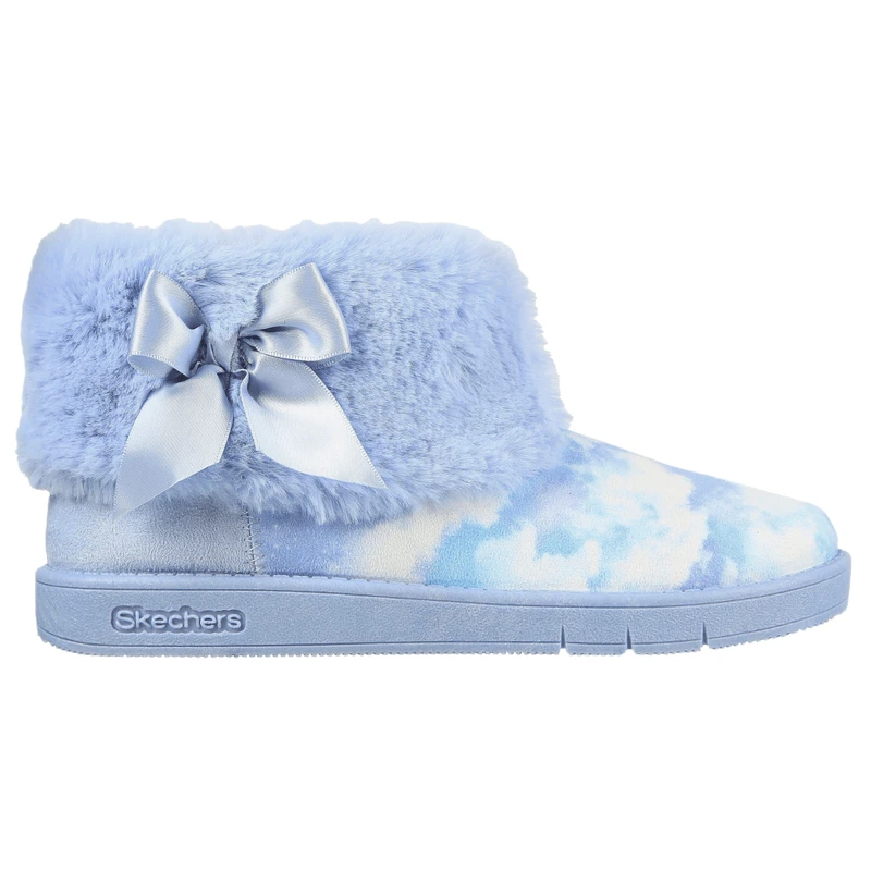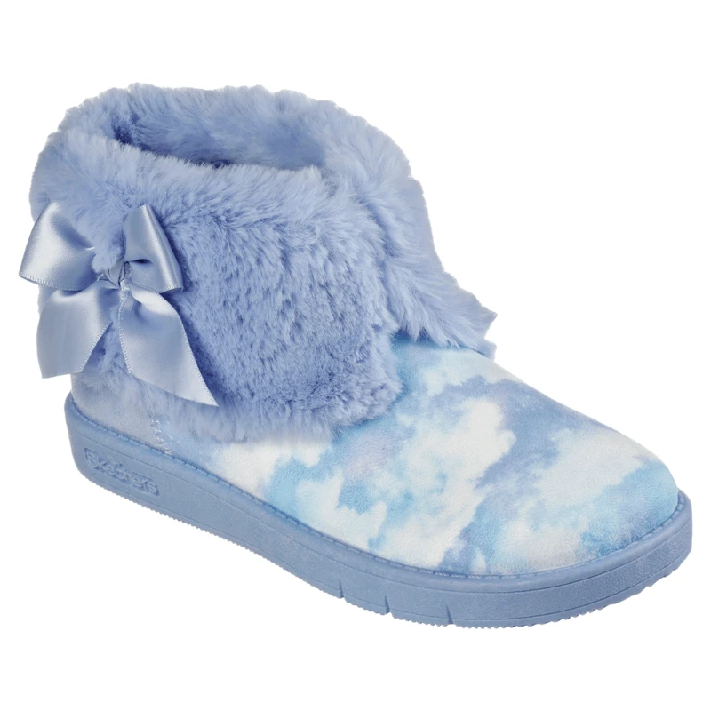 Plush comfort meets colorful style in the Skechers Sleepy Slides – Fluffy Cloudz. This high-top slipper features a soft woven fabric cloud print upper with a plush faux-fur trim and lining.Â