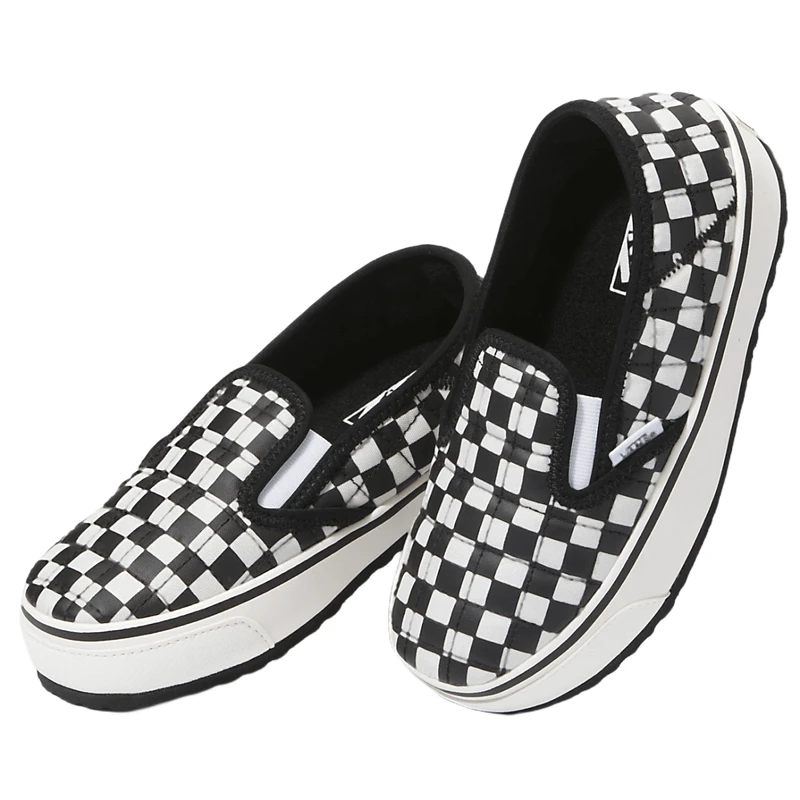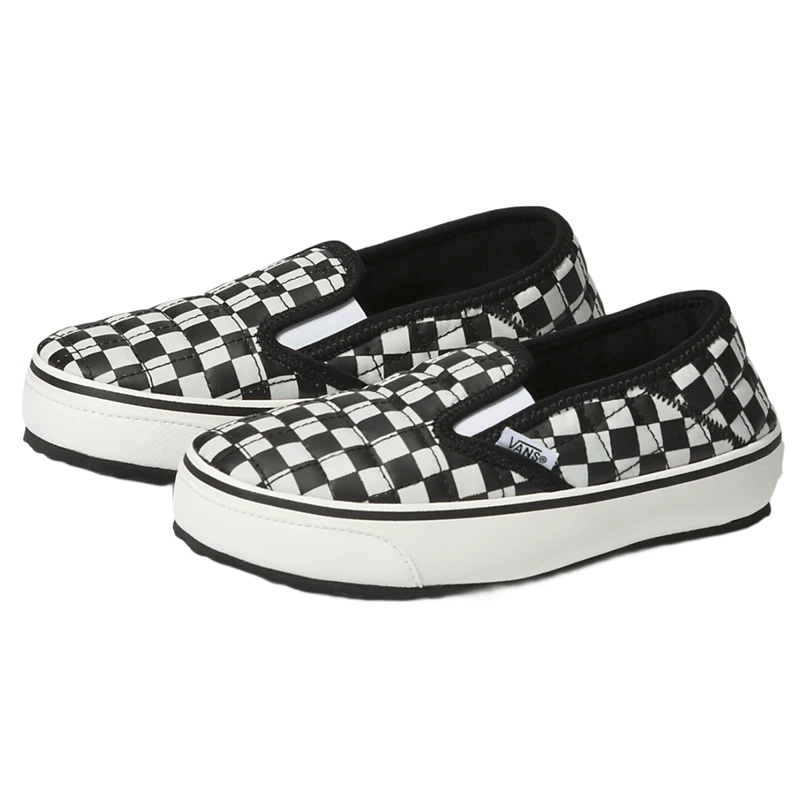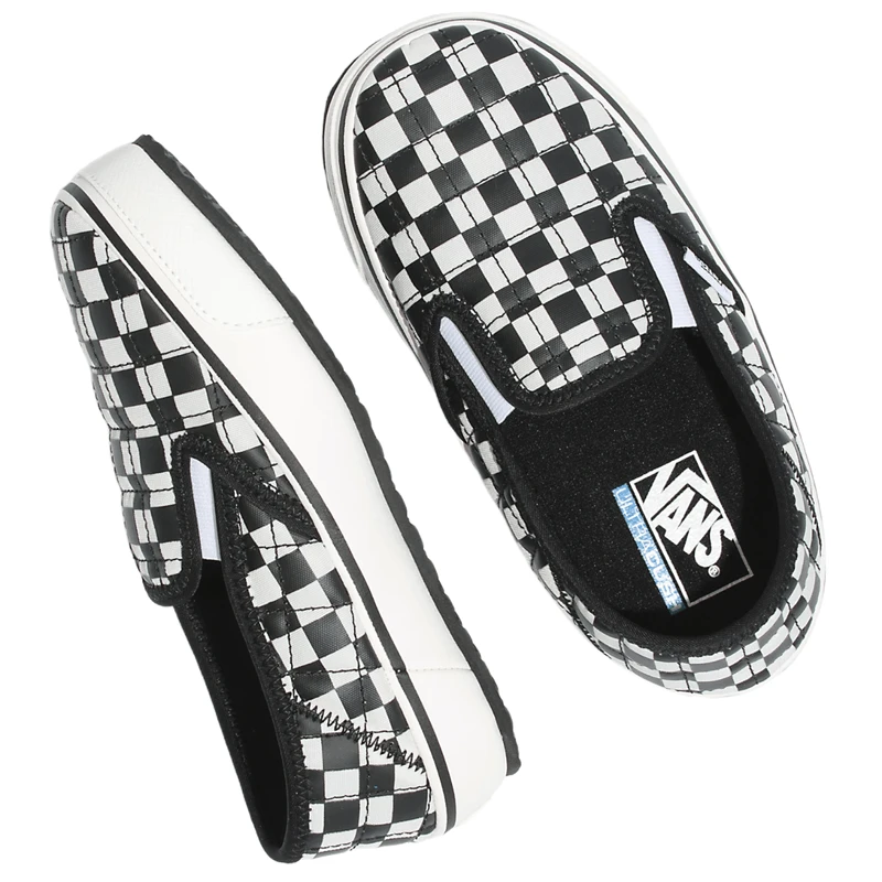 The Checkerboard Kids Slip-Er 2, inspired by the Vans Classic Slip-On, is an all-terrain slipper that blends old school Vans DNA with modern comfort. Featuring checkerboard textile and synthetic uppers with collapsible heels, a synthetic leather outsole wrap, blown rubber waffle outsoles, and UltraCush sockliners, this casual slip-on shoe combines the super soft feel of a slipper with upgrades that ensure you can get where you need to go in style. It is made with water-based inks and glues.